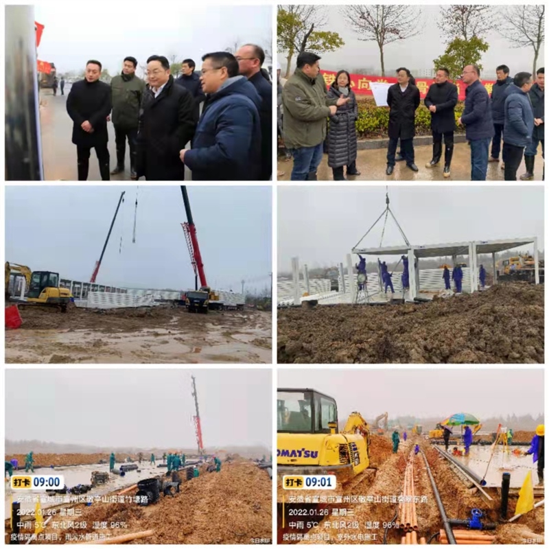 截止1月26日,現場已完成10000平方米混凝土硬化,雨污水管道、室外水電管道安裝進展迅速,集裝箱板房開始拼裝。天氣惡劣、工期緊迫,一線人員努力克服各種困難和障礙,迎難而上。1月25日下午,區(qū)政府召開宣州區(qū)新冠肺炎疫情防控工作專題會議,審定了隔離點項目方案,明確了相關事項,會議對施工進度和現場管理給予了充分的肯定,同時也要求在嚴把工程質量關和隔離點各項要求的基礎上,倒排工期,加快施工,確保早日交付使用。